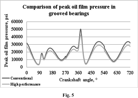 The two bearing oil groove designs have been compared in terms of peak oil film pressure. The results of the calculations for a full cycle of the four stroke engine (720º) are presented in Fig.5.