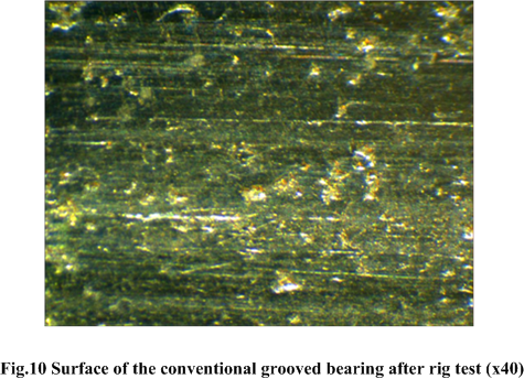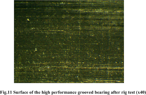 The bearing with the modified groove design also finished the test without failure. Its appearance is very similar to that of the conventional bearing, with the difference that it has no fatigue cracks on its surface. Also, there is no wear of the overlay surface (Fig.11).